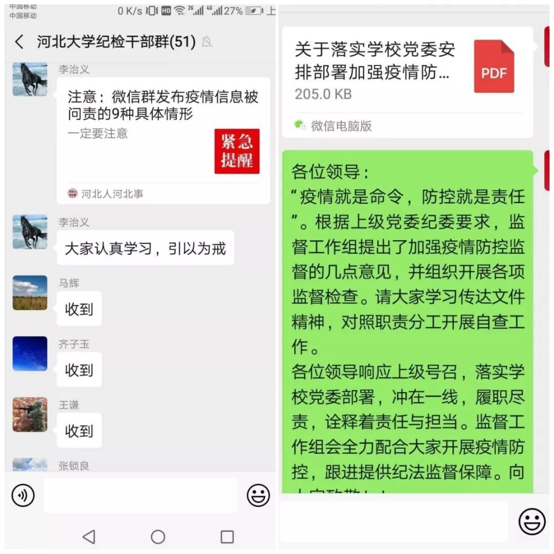 疫情发生后,河北大学党委高度重视,密切关注疫情进展和各级党委政府、教育主管部门的安排部署,第一时间成立学校新型冠状病毒感染的肺炎疫情防控工作领导小组,并专设“监督工作组”,坚持领导带班、专人值班,纪委委员、专职纪检干部分片包联,纪检委员全部下沉一线进行监督,形成上下贯通、一体联动的工作机制。校纪委第一时间制订《河北大学新型冠状病毒感染的肺炎疫情防控专项监督工作方案》《学校基层党委疫情防控专项监督责任清单》,对工作机制、工作要求、监督重点等进行安排部署。加强信息宣传工作,通过电话通知、微信群等方式转发案例警示、纪律监督政策解读等20余条,力行压力传导,要求各责任单位防控工作不过夜,任务落实不打折扣,确保疫情防控各项决策部署贯彻落实到位。